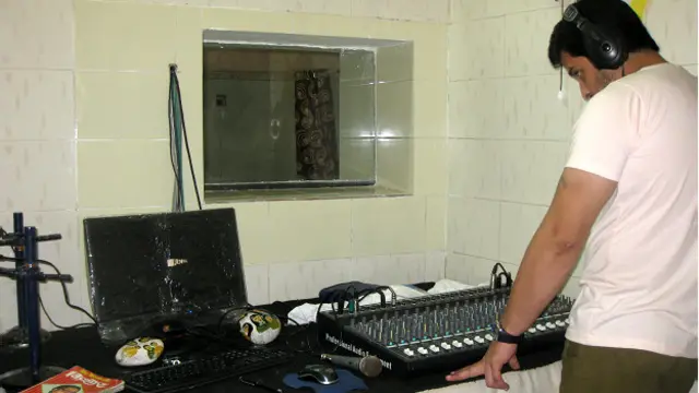 अंडरट्रायल या विचाराधीन क़ैदियों वाली जेल नंबर एक का एफ़एम टीजे स्टूडियो एक 15 x10 फ़ुट के कमरे से चलाया जा रहा है. कमरे में एक कंप्यूटर, एक कंसोल और एक माइक रखा है.