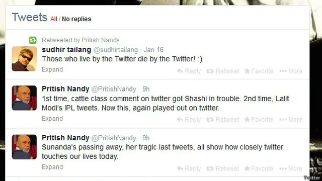 केंद्रीय मानव संसाधन राज्य मंत्री शशि थरूर की पत्नी की मौत के एक दिन पहले, एक मशहूर कार्टूनिस्ट ने ट्वीट किया था, "जो ट्विटर पर जीते हैं, वो ट्विटर पर मरते हैं!".