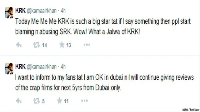 केआरके के ट्विटर एकाउंट के मुताबिक वो खुद भारत छोड़कर दुबई जा चुके हैं. वजह है कि कुछ समय पहले नरेंद्र मोदी के चुनाव प्रचार को देखते हुए उन्होंने अपने ट्विटर एकाउंट पर लिखा था कि अगर मोदी जीतते हैं तो वो भारत छोड़कर किसी और देश चले जाएंगे.
