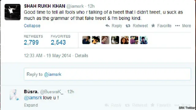 लेकिन शाहरुख खान ने इस नकली ट्वीट की तस्वीर के खिलाफ़ नाराज़गी ज़ाहिर करते हुए कहा, ''उन सभी बेवकूफ़ लोगों को, जो एक ऐसे ट्वीट की बात कर रहे हैं जिसे मैंने नहीं लिखा मैं ये कहना चाहता हूं कि आप सभी उतने ही ख़राब और बचकाने हैं जितनी उस ट्वीट की गलत-सलत अंग्रेज़ी, और ये बात मैं बहुत संभलकर लिख रहा हूं.''
