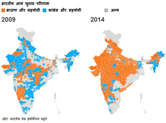 राष्ट्रीय स्तर पर भाजपा को 31 प्रतिशत वोट मिले और उसे 282 सीटें मिलीं जबकि कांग्रेस के खाते में 19.3 प्रतिशत वोट आए और उसकी सीटों की संख्या 44 रही. वरिष्ठ पत्रकार सिद्धार्थ वरदराजन लिखते हैं कि दोनों पार्टियों के बीच 12 प्रतिशत वोटों का अंतर है, लेकिन सीटों में 500 प्रतिशत का अंतर है.