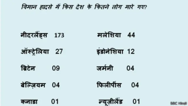 इसके अलावा बीबीसी हिंदी के फ़ेसबुक पेज पर लोग वो स्लाइड भी शेयर कर रहे हैं जिसमें बताया गया है कि किस देश के कितने लोग विमान हादसे में मारे गए हैं.