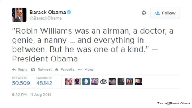 अमरीका के <link type="page"><caption> राष्ट्रपति बराक ओबामा</caption><url href="https://twitter.com/BarackObama/status/499002971573981184" platform="highweb"/></link> ने ट्विटर पर कहा ''रॉबिन विलियम्स एक एयरमैन थे, एक डॉक्टर थे, एक जिन्न थे, एक आया थे और इसके बीच में सब कुछ थे. पर वो अपनी क़िस्म के अकेले थे.''