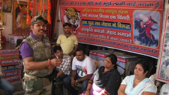 इसी प्रांगण में युवकों का एक और समूह है जो 'लव जिहाद' से लड़कियों को बचाने का संकल्प ले रहा है.