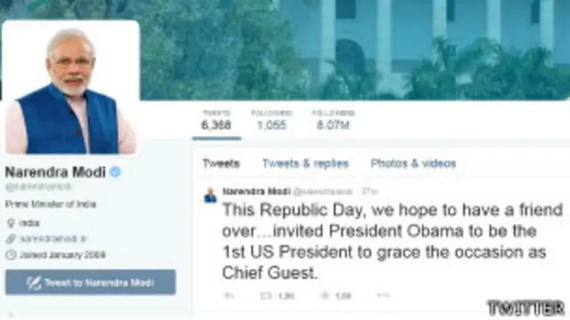 मोदी ने इस बारे में ट्वीट किया था, "इस गणतंत्र दिवस पर हमें एक दोस्त के यहाँ आने की उम्मीद है. मैंने राष्ट्रपति ओबामा को निमंत्रण दिया है कि वो इस मौक़े पर चीफ़ गेस्ट बनने वाले पहले अमरीकी राष्ट्रपति बनें."
