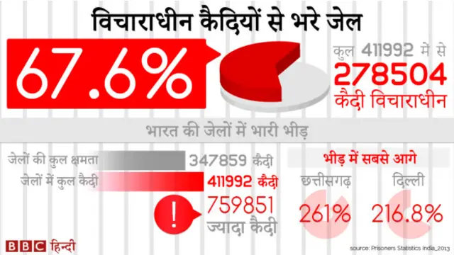 नेशनल क्राइम रिकॉर्ड्स ब्यूरो के ताज़ा आंकड़ों के मुताबिक भारत की जेलों में उनकी क्षमता से काफ़ी ज़्यादा क़ैदियों को रखा गया है और इनमें से अधिकतर विचाराधीन क़ैदी ही हैं.