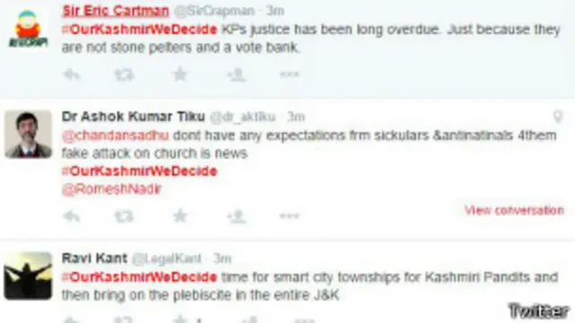 कुछ ही देर में यह विरोध ट्विटर पर <link type="page"><caption> #OurKashmirWeDecide</caption><url href="https://twitter.com/search?q=%23OurKashmirWeDecide&src=tyah" platform="highweb"/></link> नाम से ट्रेंड करने लगा. कई लोगों ने इस हैशटैग के ज़रिए अपनी नाराज़गी ज़ाहिर की.