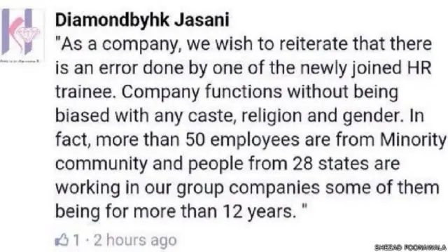 पत्र में कहा गया है कि ये एक एचआर ट्रेनी की ग़लती थी और कंपनी धर्म या जाति के आधार पर कोई भेदभाव नहीं करती है.