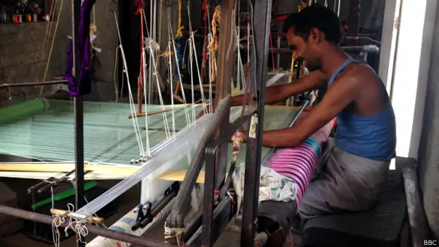 यहां घर-घर में साड़ी बुनने के हैंडलूम लगे हैं. बाहरी तापमान 45 डिग्री सेलसियस है और भरी दोपहरी में बिजली भी गुल है. लेकिन बुनकर इन सब की परवाह किए बिना लूम पर साड़ियां बुन रहे हैं.