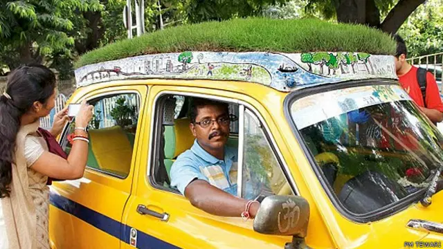 कोलकाता के तपते मौसम में यह टैक्सी आंखों को तो सुकून देती ही है, शरीर को भी ठंडक भी पहुंचाती है. टैक्सी की छत पर हरी घास लगी है और भीतर पर्यावरण रक्षा के संदेश लिखे गमलों में पौधे.
