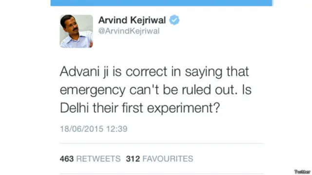 दिल्ली के मुख्यमंत्री अरविंद केजरीवाल ने ट्वीट किया है कि आडवाणी ये कहने में सही हैं कि इमरजेंसी की संभावना को नकारा नहीं जा सकता और साथ ही सवाल उठाया कि क्या दिल्ली उनका पहला प्रयोग है?