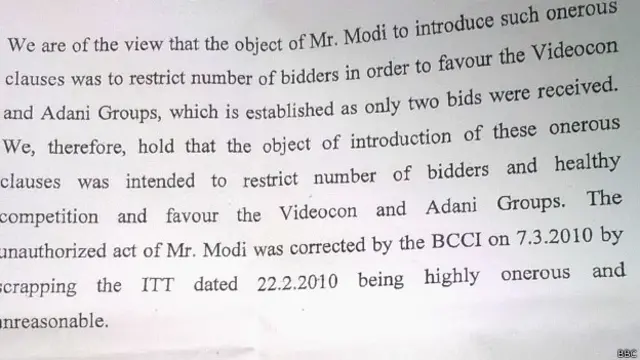 समिति ने कहा कि उनकी राय में ललित मोदी ने ये शर्तें इसलिए जोड़ी ताकि नीलामी में अधिक पार्टियां हिस्सा न ले सकें. हुआ भी यही और सिर्फ़ अडानी और वीडियोकॉन समूह की ही बोलियां बीसीसीआई को मिलीं.