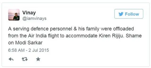 ट्विटर पर @imvinays हैंडल से लिखा गया, "भारतीय सेना के एक अधिकरी और उनके परिवार उतार दिया गया ताकि किरण रिजिजू को जगह दी जा सके. शर्म करो मोदी सरकार."