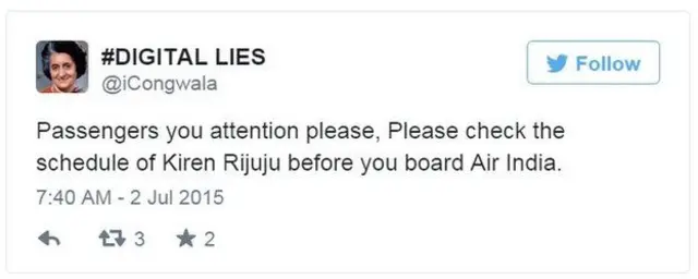 एक अन्य ट्विटर हैंडल @Congwala ने लिखा, "यात्रियों कृपया ध्यान दें. एयर इंडिया में सफर करने से पहले किरण रिजिजू का कार्यक्रम जरूर चेक कर लें."