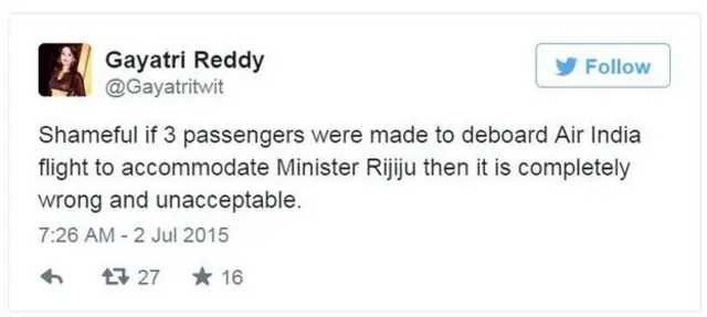वहीं @Gayatritwit से लिखा गया, "शर्म की बात है, अगर तीन यात्रियों को एयर इंडिया की फ्लाइट से इसलिए उतार दिया गया कि मंत्री रिजिजू को बिठाया जा सके. पूरी तरह ग़लत और अस्वीकार्य है."