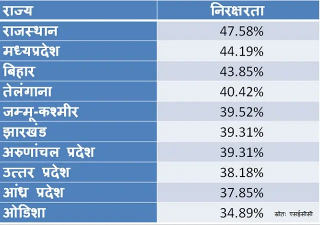 सबसे बड़ा ताज्जुब, दक्षिण के दो प्रदेश- तेलंगाना और आंध्रप्रदेश का शीर्ष दस निरक्षर प्रदेशों की सूची में होना है.