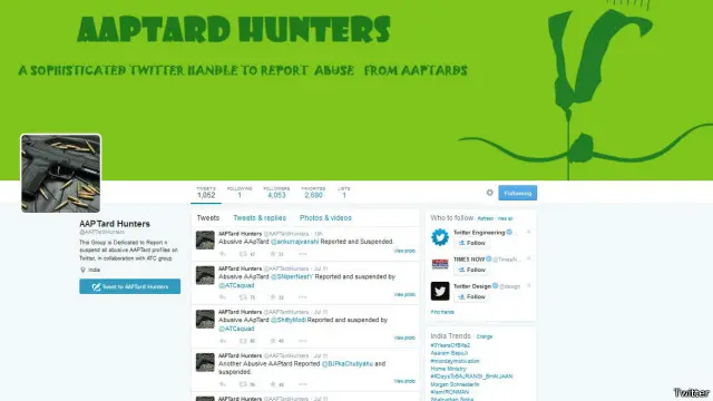 लेकिन ये अकेला अकाउंट नहीं है. एक और अकाउंट है @AAPTardHunters जिसने हज़ार से अधिक ट्वीट किए हैं और इसके चार हज़ार से अधिक फ़ॉलोअर्स हैं.
