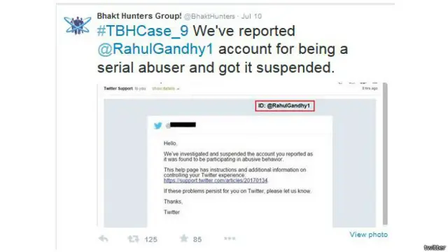 ऐसा लगता है कि @Bhakthunters या @AAPTardHunters ने ट्विटर के नियमों को फ़ॉलो करते हुए ही कई अकाउंट सस्पेंड कराए हैं यानी कि किसी भी गाली गलौज वाले अकाउंट को पूरा फ़ॉर्म भरकर रिपोर्ट किया गया और फिर इन अकाउंटों को नियमों का उल्लंघन करता हुआ पाया गया और वे सस्पेंड हो गए.