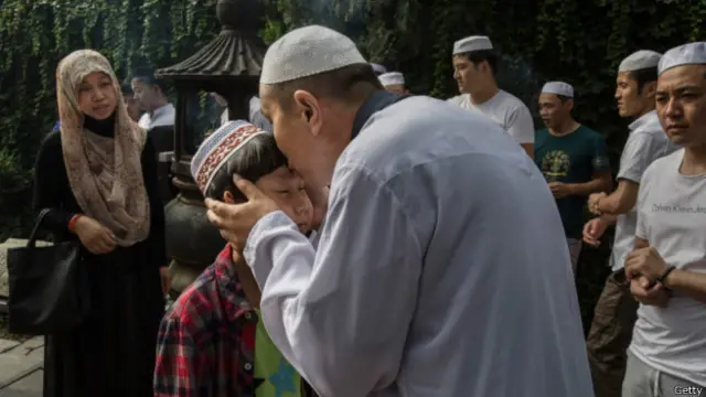 चीन में ईद के मौके पर एक बच्चे को चूमते एक इमाम. चीन में हुई जातीय अल्पसंख्यक समुदाय के लोगों की आबादी दो करोड़ है. इस समुदाय के लोगों ने भी रमज़ान ख़त्म होने के बाद ईद मनाई गई.