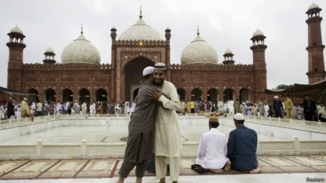 पाकिस्तान के शहर लाहौर की बादशाही मस्जिद में एक दूसरे को मुबारक बाद देते लोग.