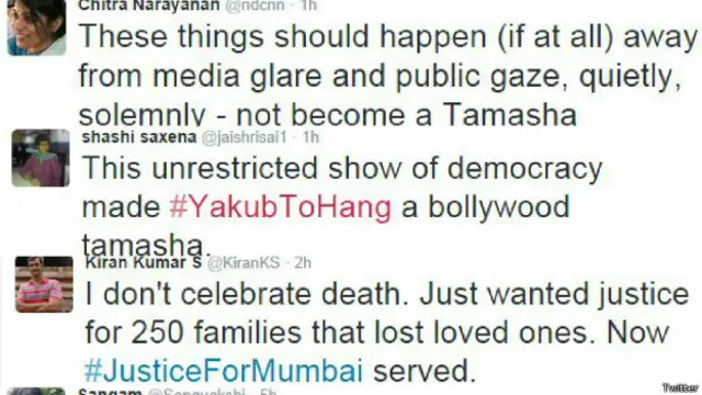 वहीं jaishrisai1 हैंडल से शशि सक्सेना लिखती हैं, ''लोकतंत्र के इस अनियंत्रित बर्ताव ने याक़ूब के मामले को बॉलीवुड तमाशा बना दिया.''