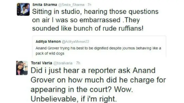 वहीं@toralvaria ने लिखा, “क्या मैंने सच में ये सुना कि एक रिपोर्टर ने आनंद ग्रोवर से पूछा कि उन्होंने कितनी फ़ीस ली. विश्वास नहीं हो रहा.”