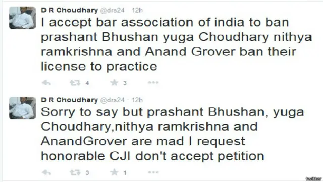 लेकिन सोशल मीडिया पर आई कई प्रतिक्रियाएँ कुछ और दर्शाती हैं. मसलन @drs24 नाम से डीआर चौधरी लिखते हैं, “बार एसोसिएशन ऑफ़ इंडिया प्रशांत भूषण, युग चौधरी, नित्य रामकृष्ण और आनंद ग्रोवर का प्रैक्टिस करने का लाइसेंस बंद करे. या @jemin जिन्होंने लिखा है, “आनंद ग्रोवर नाम का जोकर याक़ूब का पक्ष रख रहा है.”
