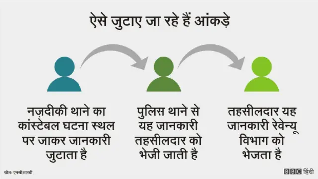 एनसीआरबी के मुताबिक आंकड़े पुलिस स्टेशनों के आधिकारिक आंकड़ों पर आधारित होते हैं. अप्राकृतिक मौतों के मामले ज़िला स्तरीय क्राइम रिकॉर्ड्स ब्यूरो में दर्ज किए जाते हैं. जिसे पहले राज्य क्राइम रिकॉर्ड्स ब्यूरो तक भेजा जाता है और उसके बाद उसे नेशनल क्राइम रिकॉर्ड्स ब्यूरो भेजा जाता है.