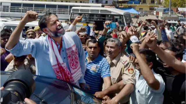 योगेंद्र यादव वहाँ भूमि अधिग्रहण विधेयक के विरोध में अपने समर्थकों के साथ प्रदर्शन कर रहे थे.