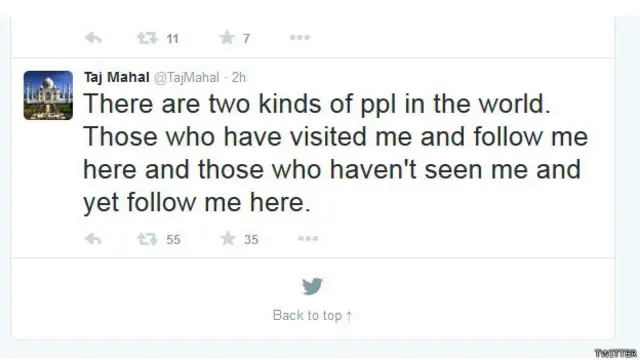 ताज महल के अकाउंट से भी एक रोचक ट्वीट आया, जिसमें लिखा था- दुनिया में दो तरह के लोग होते हैं. एक वो जो मेरे पास आए हैं और यहाँ मुझे फॉलो कर रहे हैं. दूसरे वो जिन्होंने मुझे देखा नहीं है और लेकिन यहाँ मुझे फॉलो कर रहे हैं.