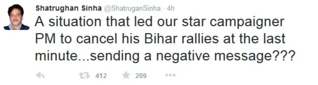 भारतीय जनता पार्टी के वरिष्ठ नेता शुत्रघ्न सिन्हा ने बिहार में 'प्रधानमंत्री नरेंद्र मोदी की रैलियों को रद्द किए जाने' के लिए अपनी ही पार्टी नेताओं को ज़िम्मेदार बताया है.
