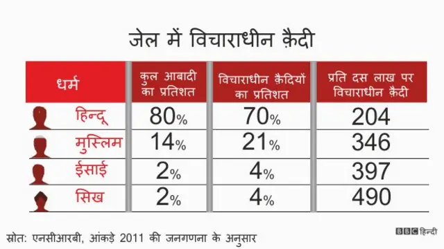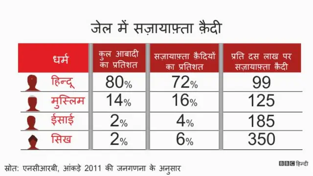आंकड़ों की मानें तो हिंदू क़ैदी भारत की जेलों में सबसे कम है जबकि देश में हिंदुओं की आबादी बाक़ी धर्म मानने वालों से कहीं अधिक है.
