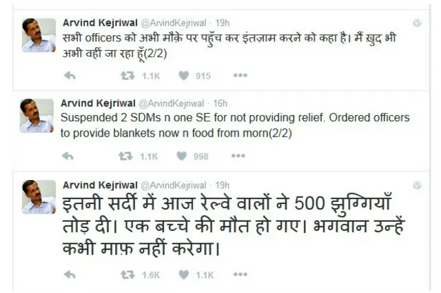 केजरीवाल ने शनिवार को ट्वीट किया, "इतनी सर्दी में आज रेलवे वालों ने 500 झुग्गियाँ तोड़ दीं. एक बच्चे की मौत हो गई. भगवान उन्हें कभी माफ़ नहीं करेगा."