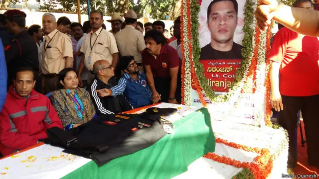 एनएसजी कमांडो लेफ्टिनेंट कर्नल ईके निरंजन को बेंगलुरु में सोमवार को श्रद्धांजलि देने के लिए हज़ारों की संख्या में पहुंचे लोगों के चेहरे पर गर्व का भाव था.
