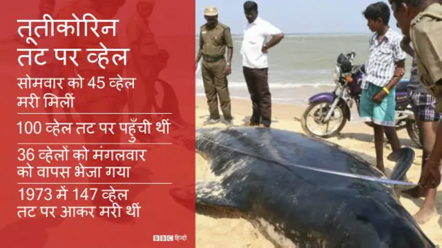 फिर समुद्र किनारे पहुँचीं इन व्हेल मछलियों को तमिलनाडु के फिशरी विश्वविद्यालय के बचाव दल, मछुआरों और मत्स्य और वन विभाग के अधिकारियों और सुगंधी देवदासन समुद्री शोध संस्थान के अधिकारियों ने गहरे पानी में पहुँचाया था.