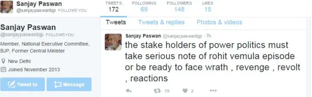 संजय पासवान ने ट्वीट किया, “सत्ता की राजनीति के भागीदारों को रोहित वेमुला प्रकरण को गंभीरता से लेना चाहिए या फिर विरोध, बदला, विद्रोह और प्रतिक्रियाओं के लिए तैयार रहना चाहिए.”