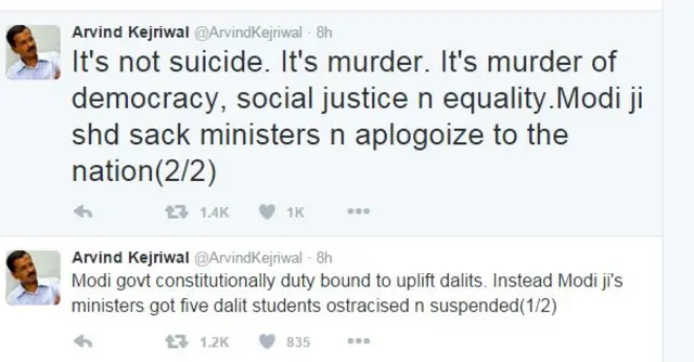 केजरीवाल ने एक और ट्वीट में कहा, ‘‘दलितों का उत्थान मोदी सरकार का संवैधानिक कर्तव्य है. इसके बावजूद मोदीजी के मंत्रियों ने पांच दलित छात्रों को बहिष्कृत व निष्कासित किया."