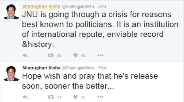 बॉलीवुड अदाकार और भाजपा सांसद शत्रुघन सिन्हा ने ट्वीट कर जेएनयू के छात्रसंघ के अध्यक्ष कन्हैया कुमार का समर्थन किया है.