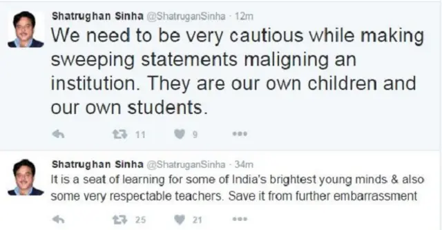 उन्होंने ट्वीट किया, "हमें संस्था के ख़िलाफ़ कोई भी टिप्पणी करने से पहले बहुत ही सावधानी बरतनी होगी. वो हमारे ही बच्चे हैं, हमारे ही छात्र हैं."