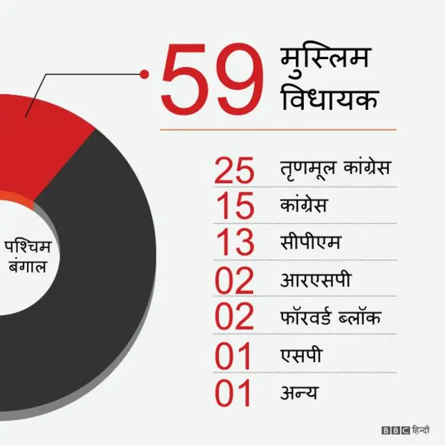 पश्चिम बंगाल की 294 सीटों वाली विधानसभा में 59 मुसलमान विधायक हैं, जो सूबे में मुसलमान वोटरों की आबादी की तुलना में काफ़ी कम हैं. इन 59 मुसलमानों में से 25 विधायक तृणमूल कांग्रेस के और 15 कांग्रेस के हैं.