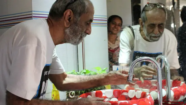 सुरती के साथ नल ठीक करने वाला एक कारीगर और एक स्वयंसेवी सहायक मौजूद होता है. जो घर वाले नल नहीं टपकने की बात करते हैं, उनसे आबिद सुरती माफ़ी मांग लेते हैं.