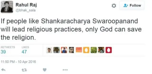 ट्विटर पर राहुल राज ने लिखा है कि अगर शंकराचार्य स्वरूपानंद जैसे लोग धर्मगुरु होंगे तो केवल भगवान ही धर्म को बचा सकता है.