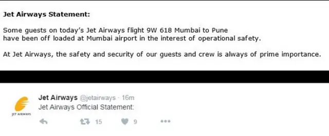 जेट एयरवेज़ ने इस संबंध में एक बयान जारी किया है. कंपनी ने कहा, “जेट एयरवेज की मुंबई से पुणे जा रही फ्लाइट 9W 618 से कुछ यात्रियों को सुरक्षा कारणों से मुंबई एयरपोर्ट पर उतार दिया गया.”