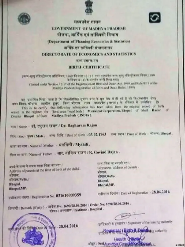 सर्टिफ़िकेट में रघुराम राजन को डॉक्टर बताया गया है. मां मैथिली और पिता का नाम आर गोविंद राजन लिखा गया है. लेकिन प्रमाणपत्र में अस्पताल का नाम और राजन के घर का पता नहीं दिया गया है.