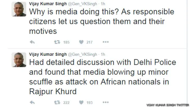 विदेश राज्य मंत्री जनरल (सेवानिवृत्त) वीके सिंह ने इस मामले पर ट्वीट करते हुए कहा, "दिल्ली पुलिस के साथ विस्तार से चर्चा की और पाया कि राजपुर खुर्द में अफ़्रीकी मूल के नागरिकों के साथ हुई छोटी घटना को मीडिया बढ़ा-चढ़ा कर बता रहा है."