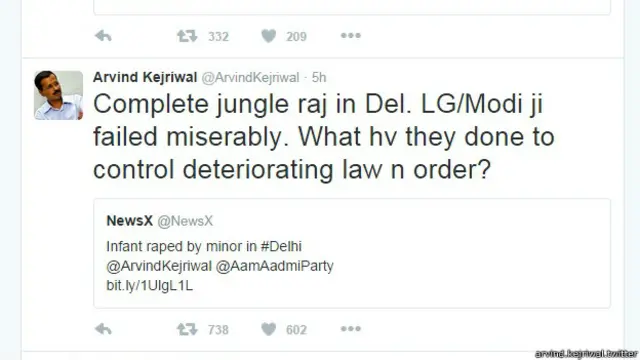 केजरीवाल अपने ट्वीट में लिखते हैं कि मोदी जी और उपराज्यपाल नजीब जंग बुरी तरह से फेल रहे हैं. वो पूछते हैं कि दिल्ली में बुरी तरह से बिगड़ती क़ानून व्यवस्था के लिए वो क्या कर रहे हैं?