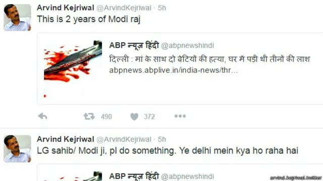 केजरीवाल एबीपी न्यूज़ की वेबसाइट से भी एक ख़बर "दिल्ली में मां के साथ दो बेटियों की हत्या, घर में पड़ी थी तीनों की लाश'' की ख़बर को ट्वीट करते हुए मोदी राज के दो साल पर सवाल उठाए हैं.