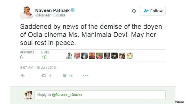 पटनायक ने बुधवार सुबह 8 बजकर 10 मिनट पर ओडिया सिनेमा की वरिष्ठ अभिनेत्री मणिमाला देवी की मृत्यु पर शोक जताते हुए उनकी आत्मा की शांति का संदेश ट्वीट किया.