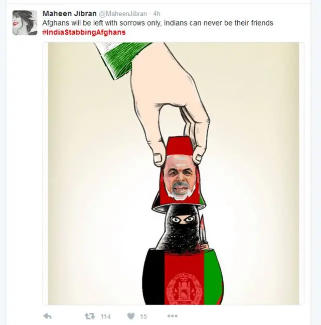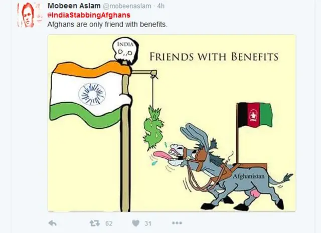 ट्विटर हैंडल @IqraShafiq0 ने इक़रा ने लिखा है- भारत अफ़ग़ानिस्तान को मुर्ख बना रहा है. भारत अफ़ग़ानिस्तान को इस्तेमाल करके पाकिस्तान में शांति प्रक्रिया को नाकाम करना चाहता है.