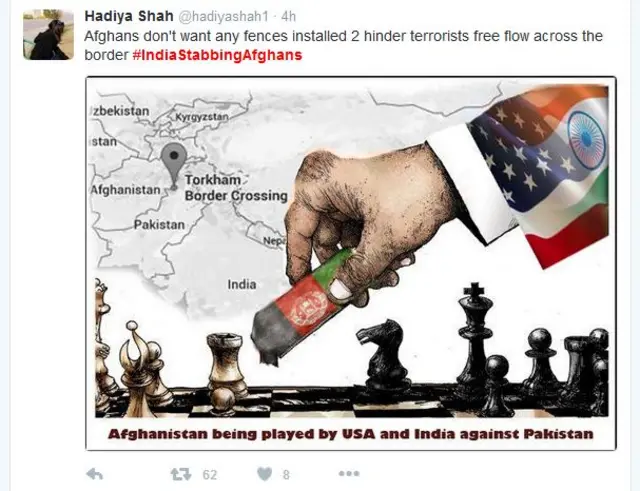 फ़ातिमा अली (@FatimaAli52) ने लिखा है- तोरख़म सीमा पर गोलीबारी पाकिस्तान और अफ़ग़ानिस्तान के बीच नहीं बल्कि पाकिस्तान और अमरीका/भारत के बीच है.